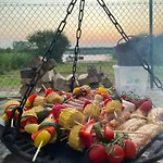 Naast self-catering voorzieningen zoals een ingerichte keuken, biedt de accommodatie gasten een eethoek buiten waar ze van hun maaltijden kunnen genieten.